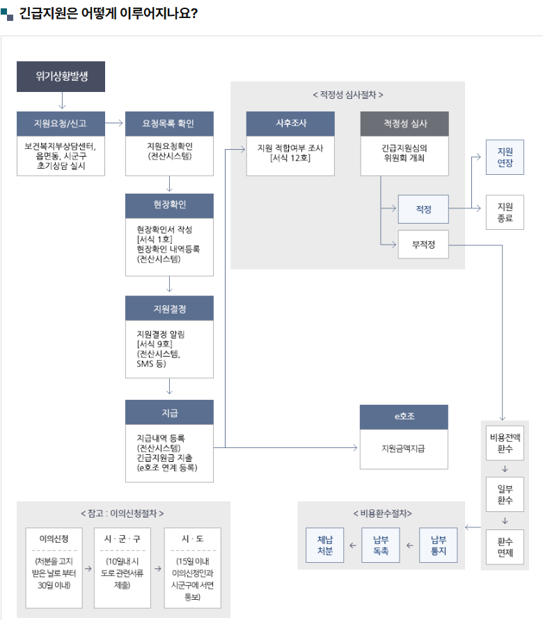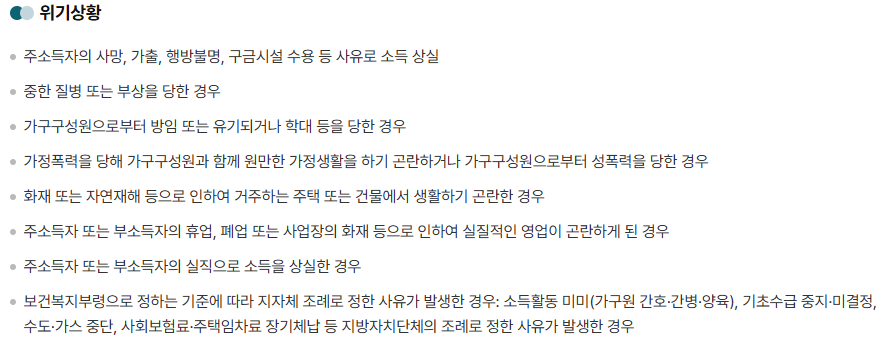 • 대상: 위기 상황 + 소득·재산 기준 충족