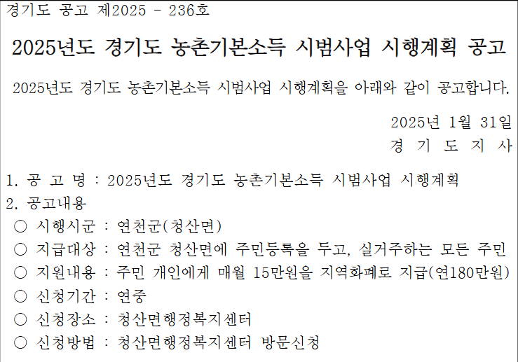 경기도 연천 청산면 주민 대상, 월 15만 원 지역 화폐로 연 180만 원 지급. 대상, 지급일, 신청방법·서류·유의사항과 정책 가치까지 자세히 정리했습니다.