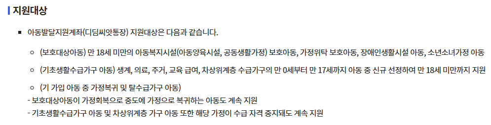 디딤씨앗통장은 만 0세부터 17세까지의 아동 중 아래 조건에 해당되면 신청 가능합니다.