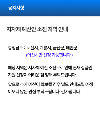 현재 위 지역은 지자체 예산 소진으로 인해 상품권 지원 신청이 어려운 점도 꼭 확인하세요! (아산시만 신청 가능)