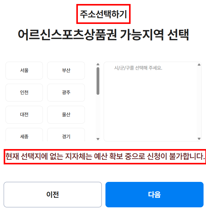 기초연금 수급 확인서에 표기된 거주지 주소로 선택 후 다음을 눌러주세요.