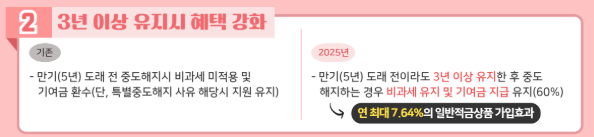 - 중도 해지 시 3년 이상 유지하면 기여금 일부(60%) 및 비과세 혜택 유지