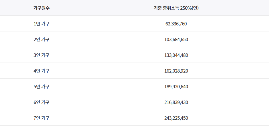 - 가구원 수에 따른 기준 중위소득 250% 이하