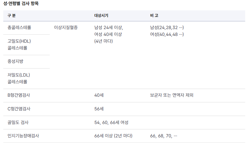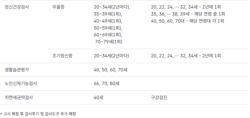 정신건강 문진(우울증), C형 간염 검사, 간 기능 검사 세분화 등